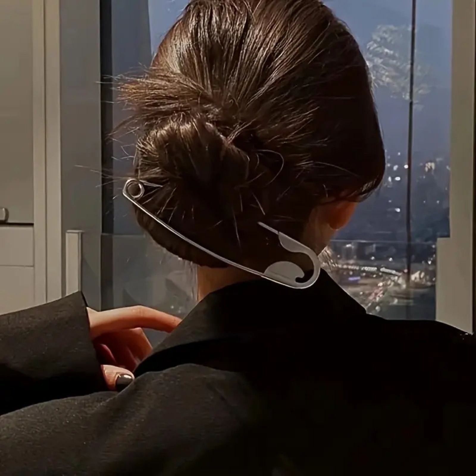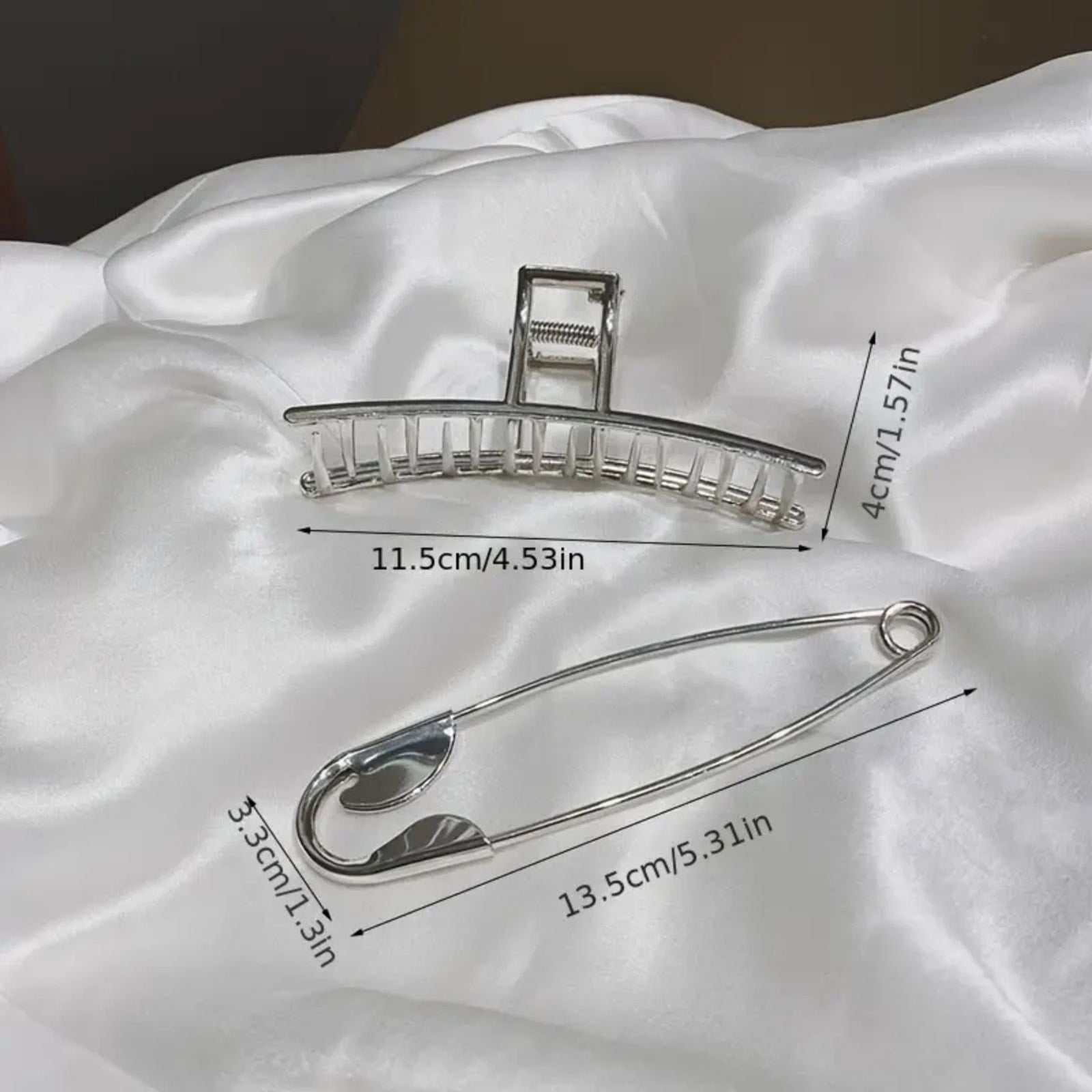 Elevate your hairstyle with this trendy metal hair clip set, featuring a unique safety pin design and a sleek claw clip. Crafted from durable silver-tone metal, these clips provide a strong grip while adding a touch of modern elegance to your look. Perfect for casual, streetwear, or chic fashion styles, these clips effortlessly hold your hair in place with comfort and durability.