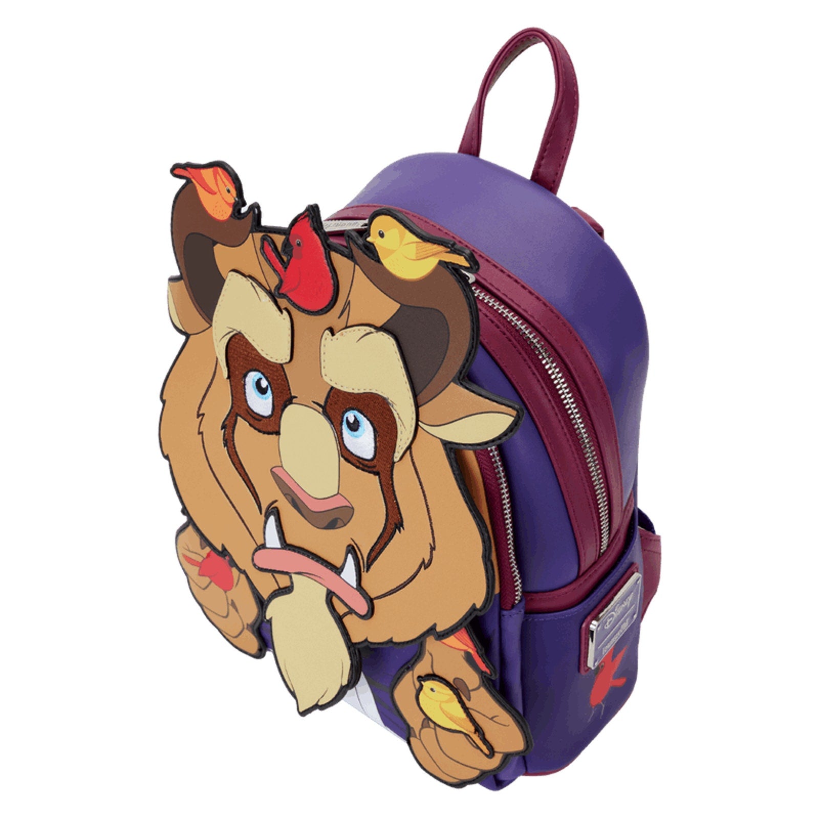 The Loungefly Disney Beauty and the Beast with Birds Mini Backpack is made of vegan leather (polyurethane). Backpack has padded adjustable shoulder straps, side pockets, and silver-colored metal hardware. Additional features include applique, printed, and embroidered details. Take note of the coordinating inside lining.